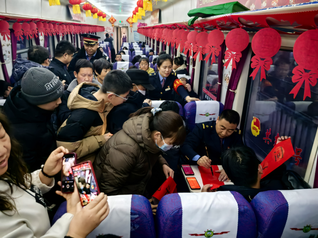 在從隴西開往青林的7504/7503次列車上開展的“新春送?!被顒?,現場書寫福字與春聯,把誠摯美好的新春祝福融入其中。