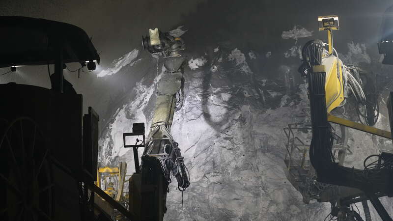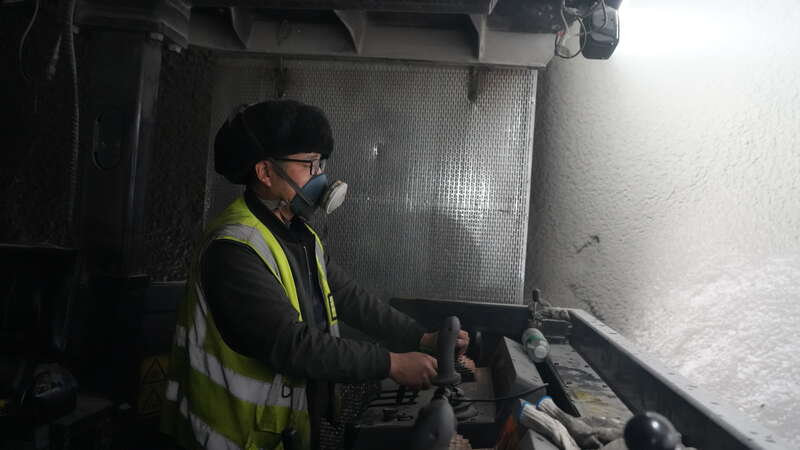 G219線昭溫公路(昭蘇至溫宿)西天山特長隧道內,施工員操縱機器作業(yè)。中青報·中青網記者 陳曉/攝