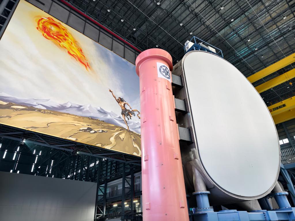 在11號廠房,墻壁上高達(dá)十幾米的夸父逐日畫像,襯托著一座形似“橘子瓣”的巨大腔體,讓科技藍(lán)為主色調(diào)的空間里有了活躍的神韻。未來,八個(gè)這樣的“橘子瓣”合而為一,下一代“人造太陽”將在里頭進(jìn)行“燃燒”實(shí)驗(yàn)。