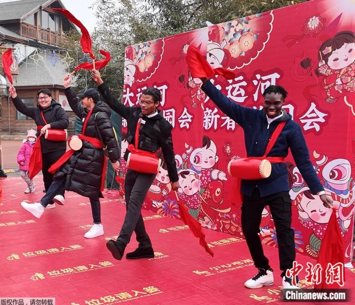 來(lái)自北京工業(yè)大學(xué)的四位留學(xué)生在北京通州大運(yùn)河新春游園會(huì)上體驗(yàn)打腰鼓。中新網(wǎng) 林勐男 攝