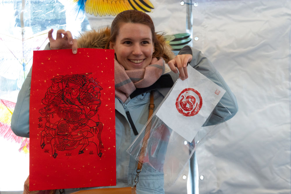 1月18日,一名女子在匈牙利首都布達佩斯舉行的新春廟會活動上手持木版年畫留影。新華社發(fā)(弗爾季·奧蒂洛攝)