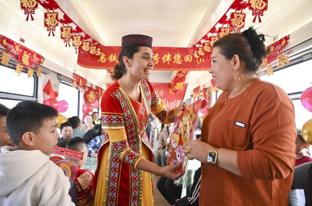 在喀什開(kāi)往成都西的列車(chē)上,艾爾開(kāi)牙·多力開(kāi)(左)向參與“列車(chē)春晚”互動(dòng)游戲的乘客贈(zèng)送福字年畫(huà)(2025年1月17日攝)。