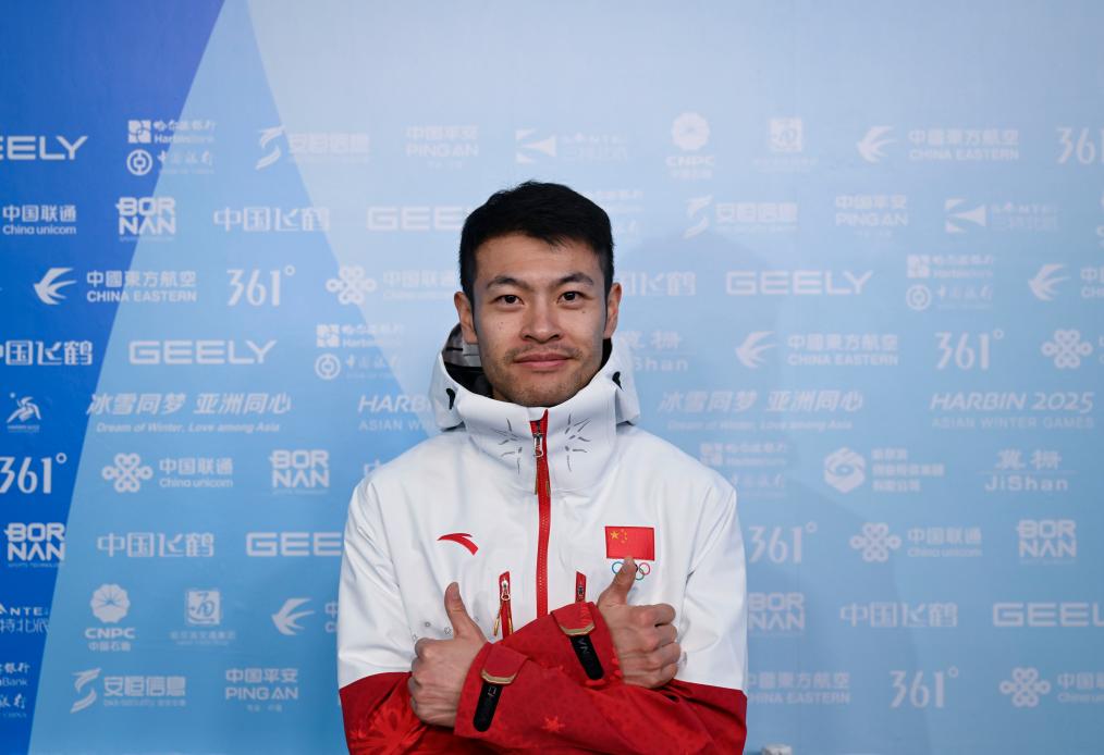 2月6日,哈爾濱亞冬會(huì)開幕式中國(guó)體育代表團(tuán)旗手寧忠?guī)r在黑龍江省冰上訓(xùn)練中心速滑館接受集體采訪。新華社記者 陳振海 攝