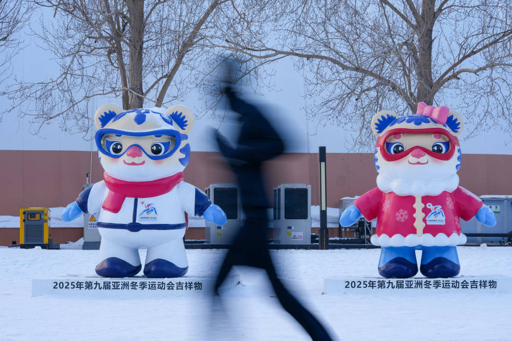 2025年1月8日,在哈爾濱湘江公園,跑步的市民從亞冬會(huì)吉祥物雕塑前經(jīng)過。