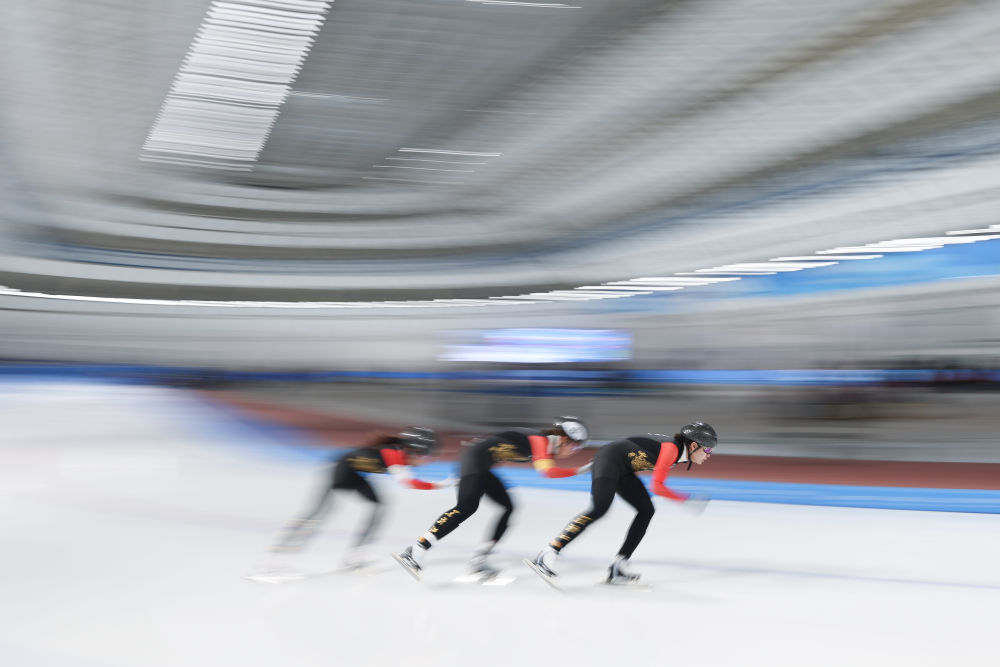 2024年12月15日,黑龍江省冰上訓(xùn)練中心二隊(duì)選手在比賽中。當(dāng)日,2024-2025賽季中國(guó)杯速度滑冰精英聯(lián)賽第四站暨亞冬會(huì)測(cè)試賽女子團(tuán)體追逐比賽在黑龍江省冰上訓(xùn)練中心舉行。