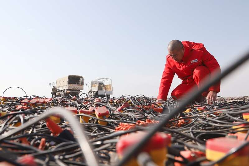 在施工現(xiàn)場,需要檢測的無線節(jié)點儀器和檢波器串擺成了一個巨大的圓形圖案,李國忠和物探隊員一起為這些儀器做“健康體檢”。李國忠介紹,無線節(jié)點儀器穩(wěn)定性高、便于攜帶,主要用在高難山體區(qū)。在沙漠區(qū)采用高精度可控震源,既保證了施工質(zhì)量、提高了施工效率,也保護了生態(tài)環(huán)境,實現(xiàn)了綠色勘探。