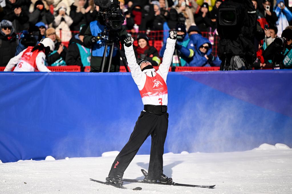 2月9日,徐夢桃在第九屆亞冬會(huì)自由式滑雪女子個(gè)人空中技巧決賽后慶祝。新華社記者 夏一方 攝