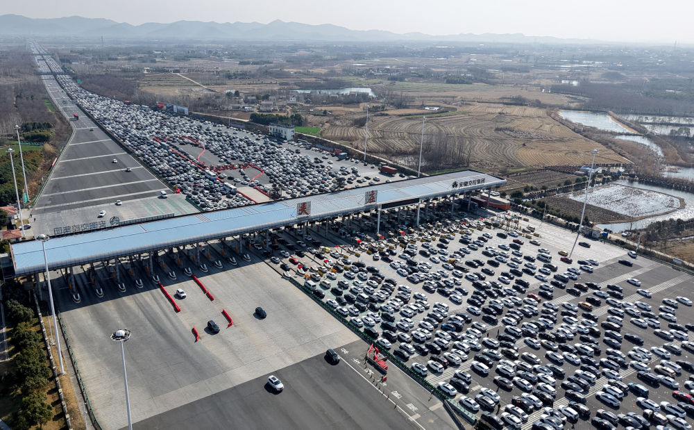 2025年2月4日,節(jié)后返程車輛通過合寧高速公路吳莊收費站(無人機照片)。新華社發(fā)(沈果 攝)