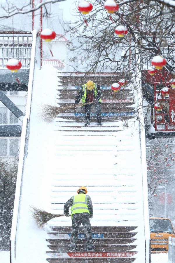 2025年1月28日,在山東省威海市環(huán)翠區(qū),市政工人冒雪清掃過街天橋積雪。新華社發(fā)(劉中華 攝)