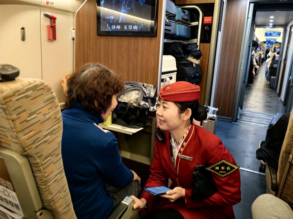 2025年1月25日,在北京開往上海的G9次列車上,列車長韓茹為一位獨自出行的老年旅客服務(wù)。新華社記者 翟翔 攝
