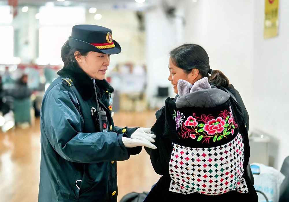 2025年1月29日,國鐵武漢局襄陽站客運員穆佟在為旅客服務(wù)。新華社發(fā)(劉娟 攝)
