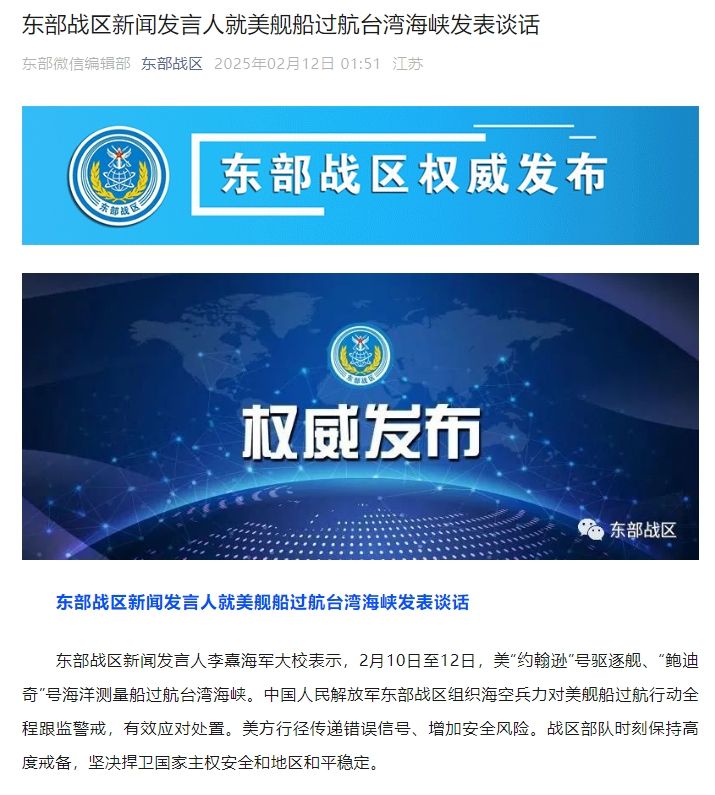 東部戰(zhàn)區(qū)新聞發(fā)言人李熹海軍大校表示,2月10日至12日,美“約翰遜”號驅(qū)逐艦、“鮑迪奇”號海洋測量船過航臺灣海峽。中國人民解放軍東部戰(zhàn)區(qū)組織??毡γ琅灤^航行動全程跟監(jiān)警戒,有效應對處置。美方行徑傳遞錯誤信號、增加安全風險。戰(zhàn)區(qū)部隊時刻保持高度戒備,堅決捍衛(wèi)國家主權(quán)安全和地區(qū)和平穩(wěn)定。