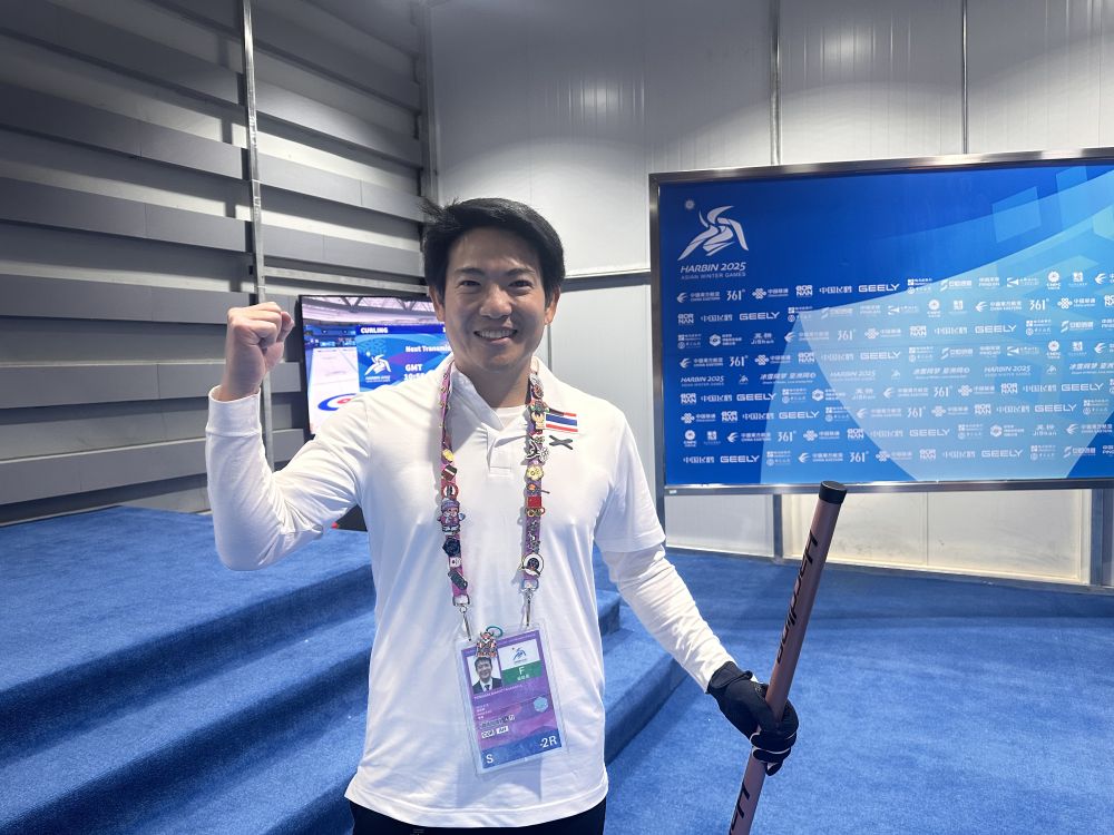 泰國(guó)冰壺男隊(duì)隊(duì)長(zhǎng)蓬塞·馬哈塔納薩昆在展示他的徽章。新華社記者 戴錦镕 攝