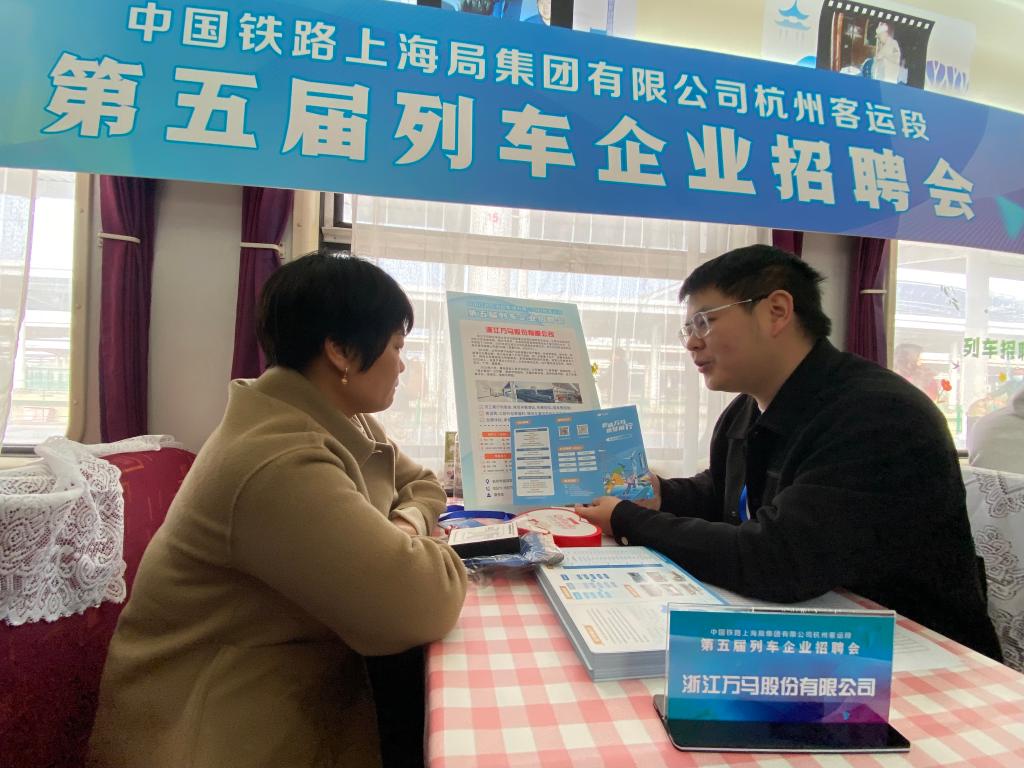 杭州客運段甬廣車隊黨總支書記朱秦予介紹,當天除了在K210次列車設置企業(yè)一對一招聘臺,列車工作人員還通過網(wǎng)絡直播,在西安開往寧波的K468次、蘭州開往杭州的T114次等列車上同步開展線上招聘會,為更多旅客提供崗位選擇。
