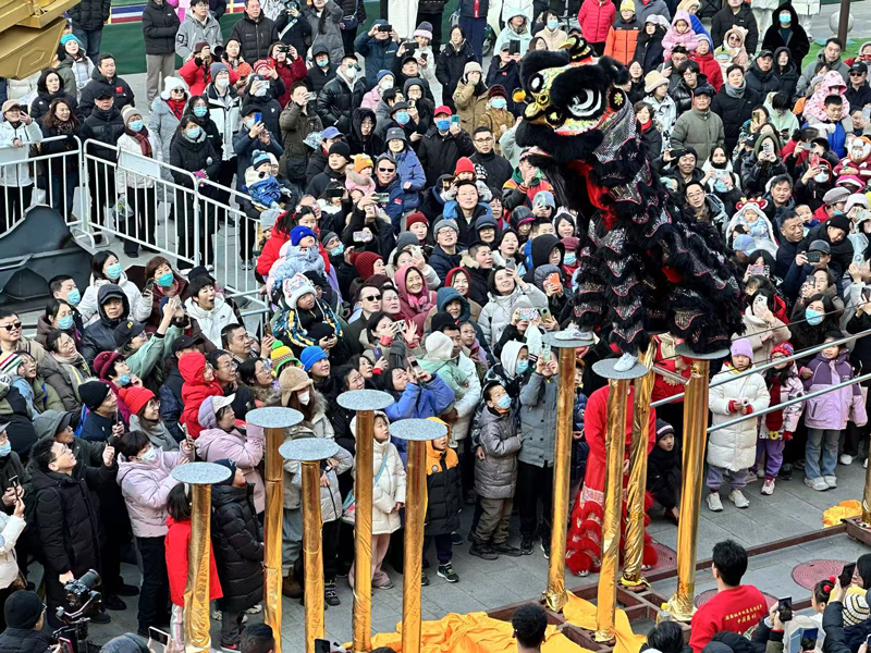 2月2日,在北京東岳廟廟會,門前的北獅表演吸引眾多市民游客駐足觀看。一位家住附近的游客對記者表示:“過年期間這里的舞獅表演每天都不一樣,南獅北獅都有。看得真過癮!”