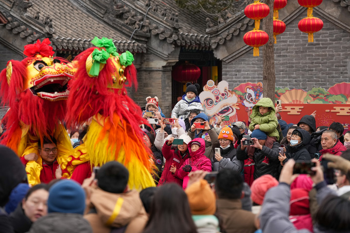 2月1日,在北京民俗博物館舉行的北京東岳廟廟會上,市民游客在觀看舞獅表演。新華社記者鞠煥宗攝