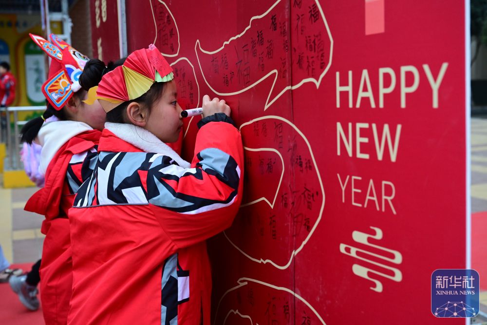 2月14日,在合肥市園上園小學(xué)喻崗分校,學(xué)生參加畫蛇添“?!被顒?dòng)。新華社記者 周牧 攝