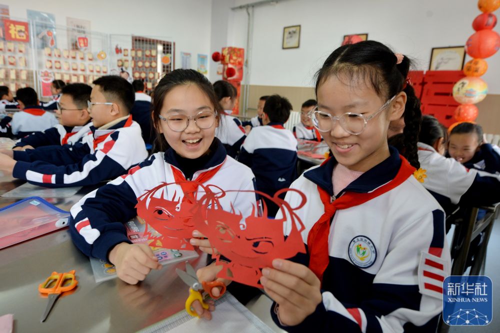 2月14日,兩名學(xué)生在山東青島宜陽路小學(xué)“傳統(tǒng)文化潤童心”主題活動(dòng)中學(xué)習(xí)“哪吒”剪紙。新華社發(fā)(王海濱攝)