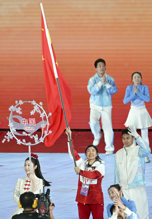 自由式滑雪運(yùn)動員徐夢桃擔(dān)任中國代表團(tuán)的旗手。35歲的她,是中國雪上項(xiàng)目的傳奇人物,實(shí)現(xiàn)了冬奧會、世錦賽、世界杯等多項(xiàng)大賽的大滿貫,成為中國雪上項(xiàng)目首位實(shí)現(xiàn)“全滿貫”的運(yùn)動員。在本屆亞冬會上,她以 90.94 分的成績奪得女子空中技巧金牌,還帶領(lǐng)團(tuán)隊(duì)在多個項(xiàng)目中斬獲佳績。她堅(jiān)韌不拔的精神和卓越的競技表現(xiàn),正是中國冰雪運(yùn)動員的代表。