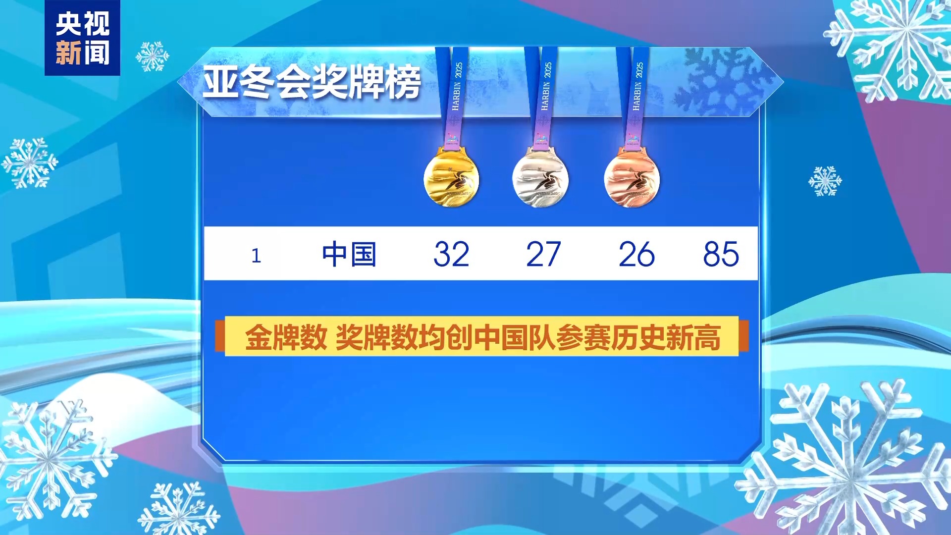 本屆亞冬會(huì)中國體育代表團(tuán)參加了全部6個(gè)大項(xiàng)11個(gè)分項(xiàng)64個(gè)小項(xiàng)的比賽,以32金27銀26銅共85枚獎(jiǎng)牌,位居金牌榜、獎(jiǎng)牌榜首位,金牌數(shù)、獎(jiǎng)牌數(shù)均創(chuàng)中國隊(duì)參賽歷史新高。