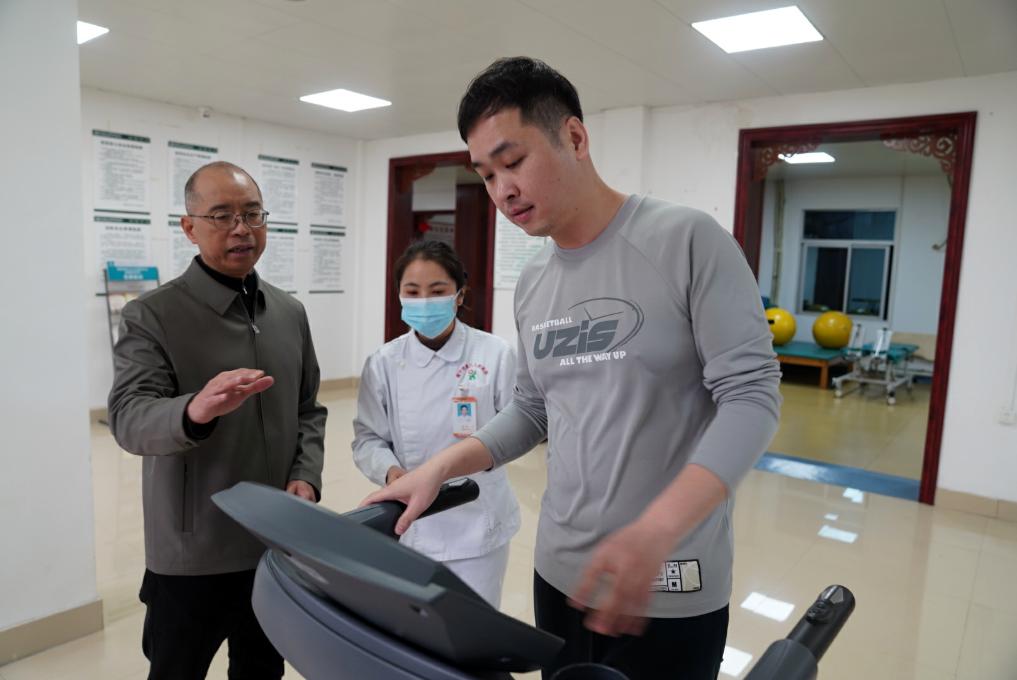 2月18日,韋軍在廣西南寧市西鄉(xiāng)塘區(qū)衡陽街道南鐵社區(qū)衛(wèi)生服務(wù)中心走訪,了解衛(wèi)生服務(wù)中心對群眾進(jìn)行運(yùn)動指導(dǎo)的情況。新華社記者 陳露緣 攝