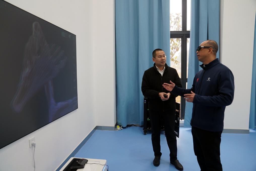 2月17日,在廣西體育高等專科學(xué)校,韋軍與運(yùn)動健康學(xué)院的老師交流,了解3D模擬運(yùn)動解剖模型如何助力教學(xué)。新華社記者 陳露緣 攝