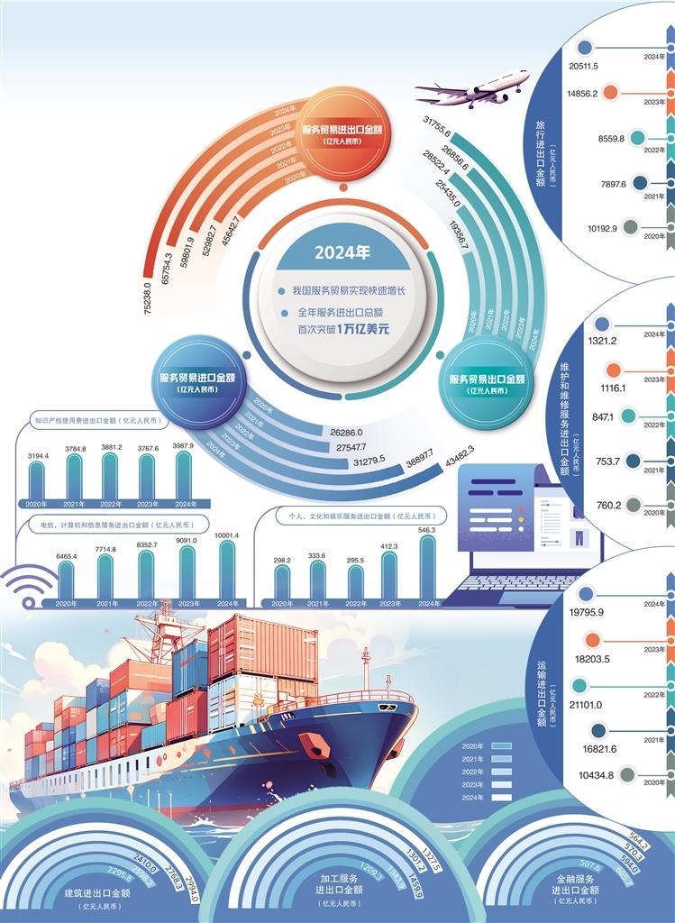 商務(wù)部數(shù)據(jù)顯示,2024年我國服務(wù)進(jìn)出口總額達(dá)7.5萬億元人民幣,同比增長14.4%,服務(wù)貿(mào)易規(guī)模首次突破1萬億美元,再創(chuàng)歷史新高。我國服務(wù)貿(mào)易實(shí)現(xiàn)了令人矚目的快速增長,展示了經(jīng)濟(jì)發(fā)展的活力和韌性,背后是多個領(lǐng)域的協(xié)同發(fā)力。