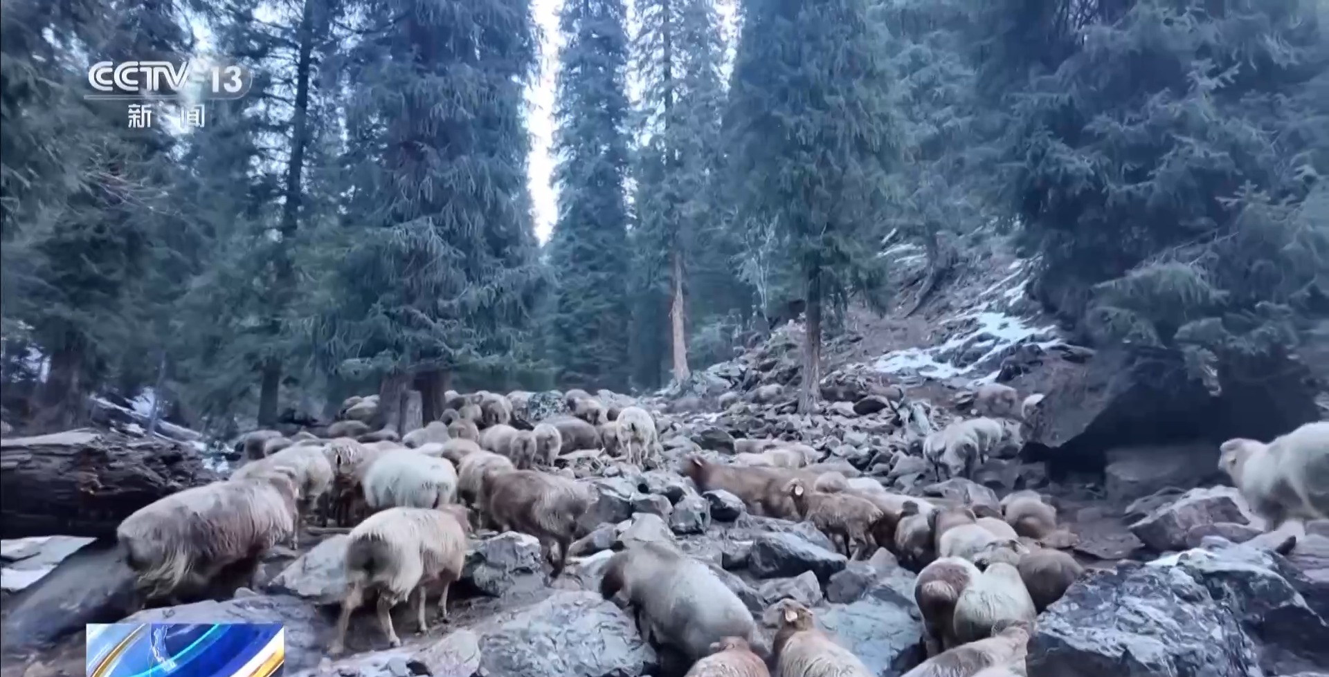 翻過達坂后,轉場的隊伍到了山下的松林,這里的積雪沒有那么厚,但要穿過一條條冰河和結冰的山路才能繼續(xù)向前。為了防止牲畜摔倒,大家要先把危險路段的冰清理掉,再撒上土防滑,才能讓馬和羊一群群通過。即使這樣,依然有一只羊的腿受了傷,簡單包扎后才繼續(xù)上路。
