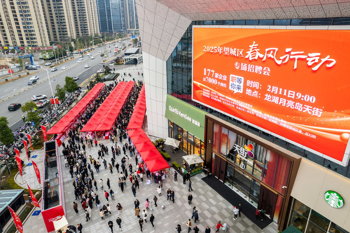 這是2025年2月11日在湖南省長(zhǎng)沙市望城區(qū)龍湖月亮島天街商場(chǎng)外坪拍攝的招聘會(huì)現(xiàn)場(chǎng)(無(wú)人機(jī)照片)。新華社記者 陳思汗 攝