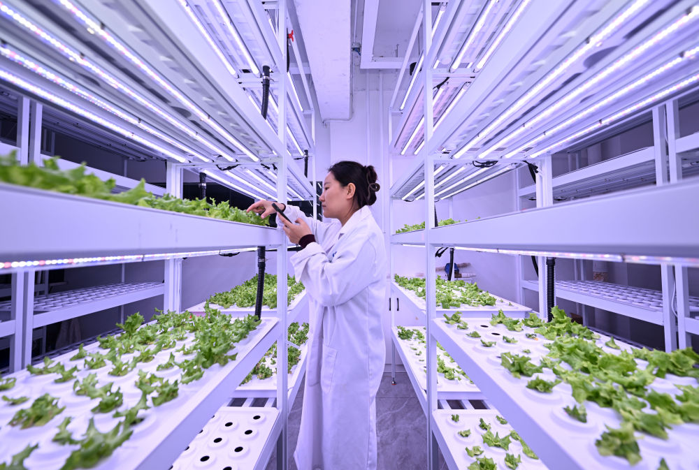 科芯(天津)生態(tài)農業(yè)科技有限公司工作人員在實驗室查看農作物生長情況。 新華社記者 趙子碩 攝