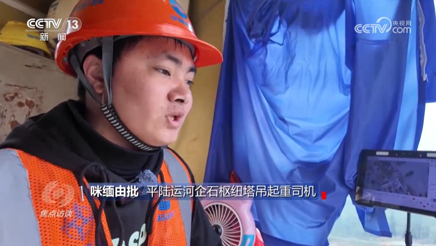 平陸運河企石樞紐塔吊起重司機咪緬由批:“第一次爬的時候是40米的那種(塔吊),剛開始就是特別害怕,腿也是發(fā)抖,一步一個腳印,就是冒著汗慢慢爬上來,然后練成了這個膽量,慢慢就習以為常了?!?/p>