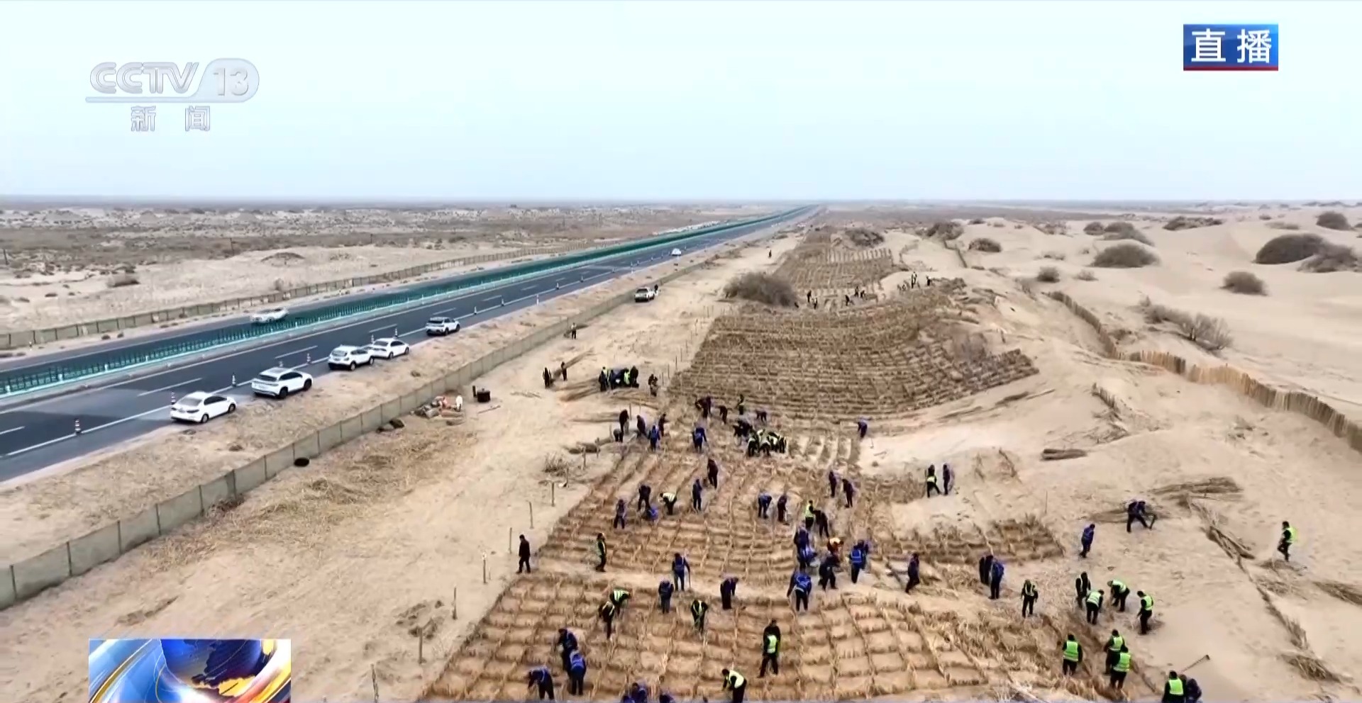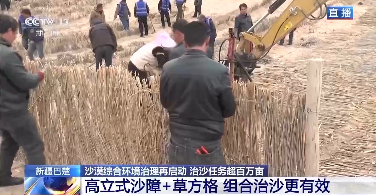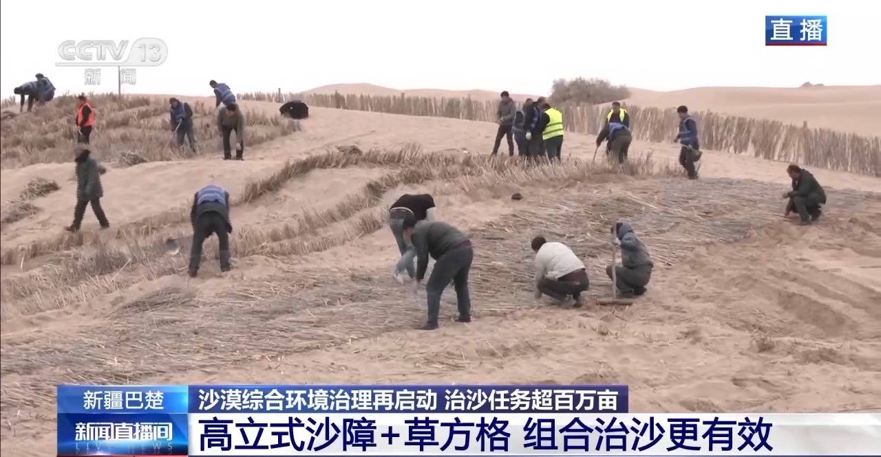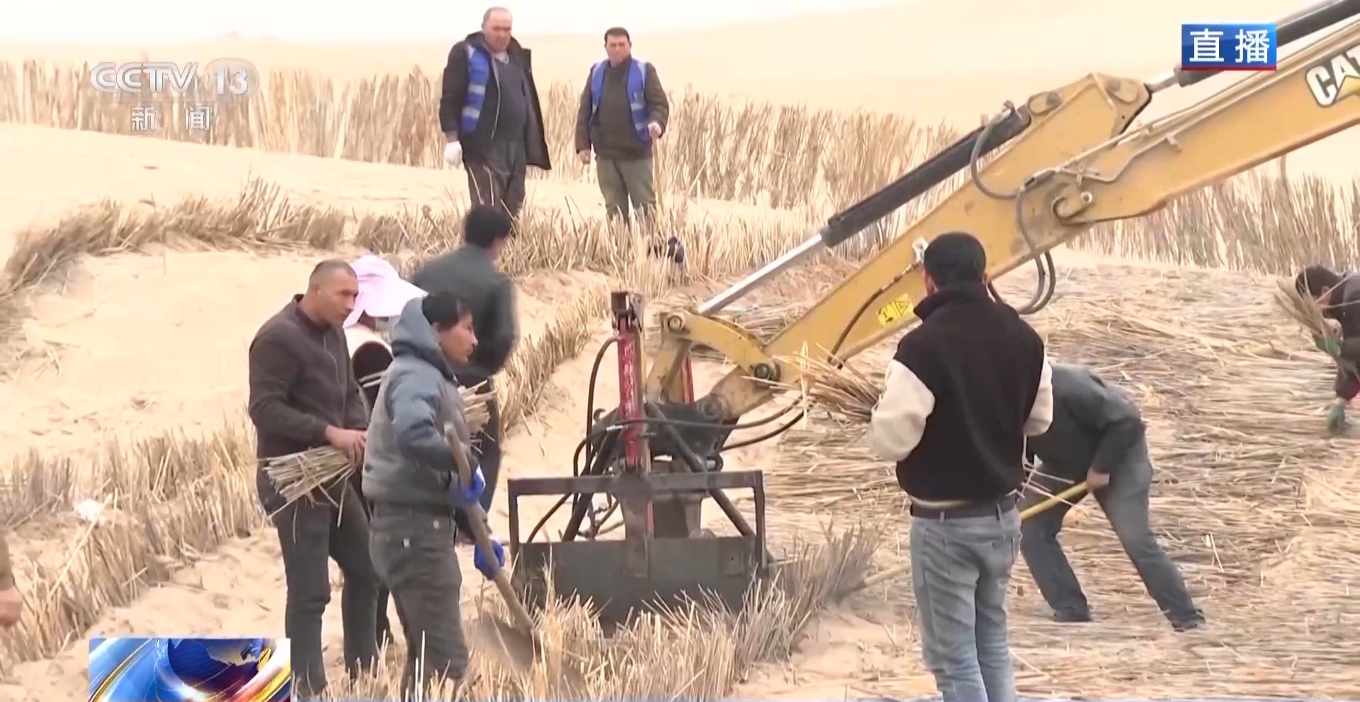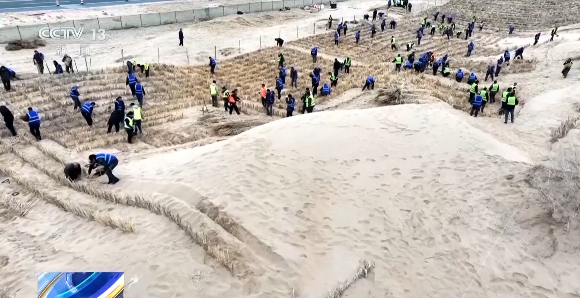 總臺記者從新疆巴楚縣阿克薩克馬熱勒鄉(xiāng)防沙治沙工程施工現場發(fā)回報道。當地的200多名各族干部群眾人工鋪設“草方格”,也就是將干蘆葦鋪設在地面,再壓進沙土中,它的主要作用是固沙。