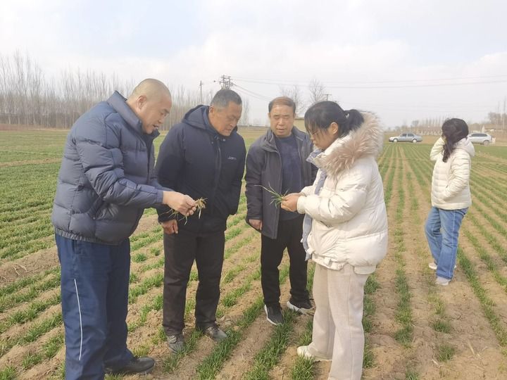 山東省夏津縣農(nóng)業(yè)農(nóng)村局植物保護(hù)站站長(zhǎng)、高級(jí)農(nóng)藝師鄭曰英(右二)正在開展小麥苗情調(diào)查、病蟲害監(jiān)測(cè),并指導(dǎo)糧農(nóng)加強(qiáng)春季田管。