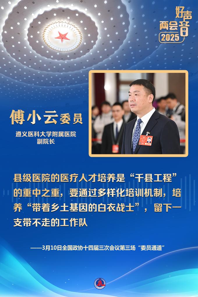 “國家持續(xù)實施‘千縣工程’,開展醫(yī)療人才‘組團式’支援幫扶,支援西藏、新疆、青海等地區(qū)醫(yī)院和國家鄉(xiāng)村振興重點幫扶縣人民醫(yī)院?!弊窳x醫(yī)科大學(xué)附屬醫(yī)院副院長傅小云委員說。