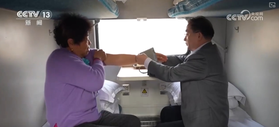 除了為重點老年旅客配備緊急呼叫定位器,銀發(fā)專列上還引入了適老化的AI智能旅行監(jiān)護設(shè)備,并安排兩名專業(yè)醫(yī)生全程車廂巡診,隨時為老年人提供健康管理服務(wù)。