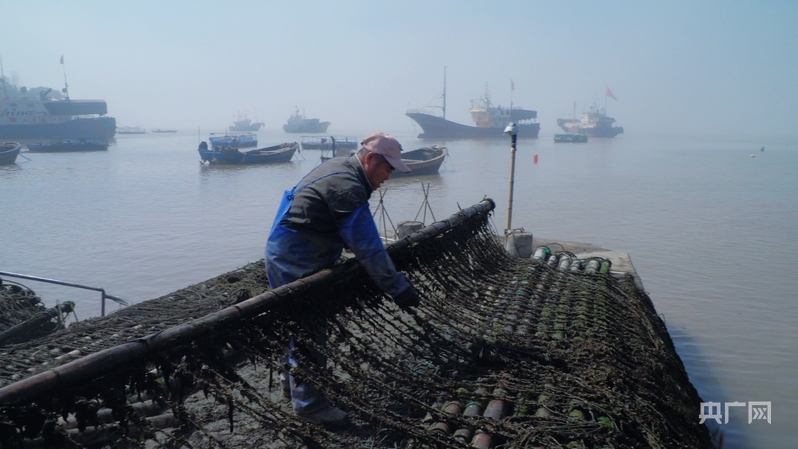 大岙村紫菜養(yǎng)殖戶虞新解清理紫菜養(yǎng)殖排架(央廣網(wǎng)發(fā) 吳寶春 攝)