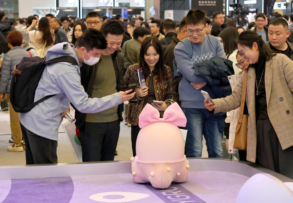 3月20日,參觀者在展會上與“Ai Me智能機器人”互動。當日,以“AI科技、AI生活”為主題的2025中國家電及消費電子博覽會(AWE2025)在上海新國際博覽中心開幕。本屆展會吸引全球千余家企業(yè)參展,全景展示家電及消費電子領域的前沿成果,呈現(xiàn)AI賦能智慧生活的新產(chǎn)品、新方案、新場景。(新華社記者 方喆 攝)