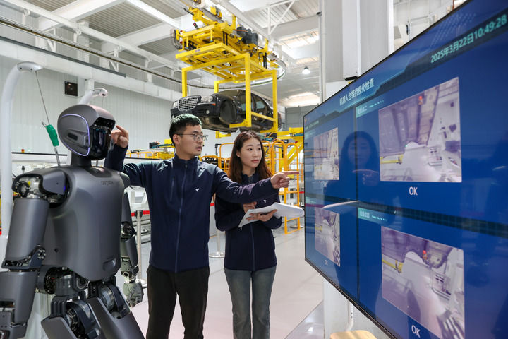 3月22日,在位于江蘇無(wú)錫的天奇股份人形機(jī)器人數(shù)據(jù)采集實(shí)訓(xùn)基地,工程師在調(diào)試人形機(jī)器人。新華社發(fā)(朱吉鵬攝)