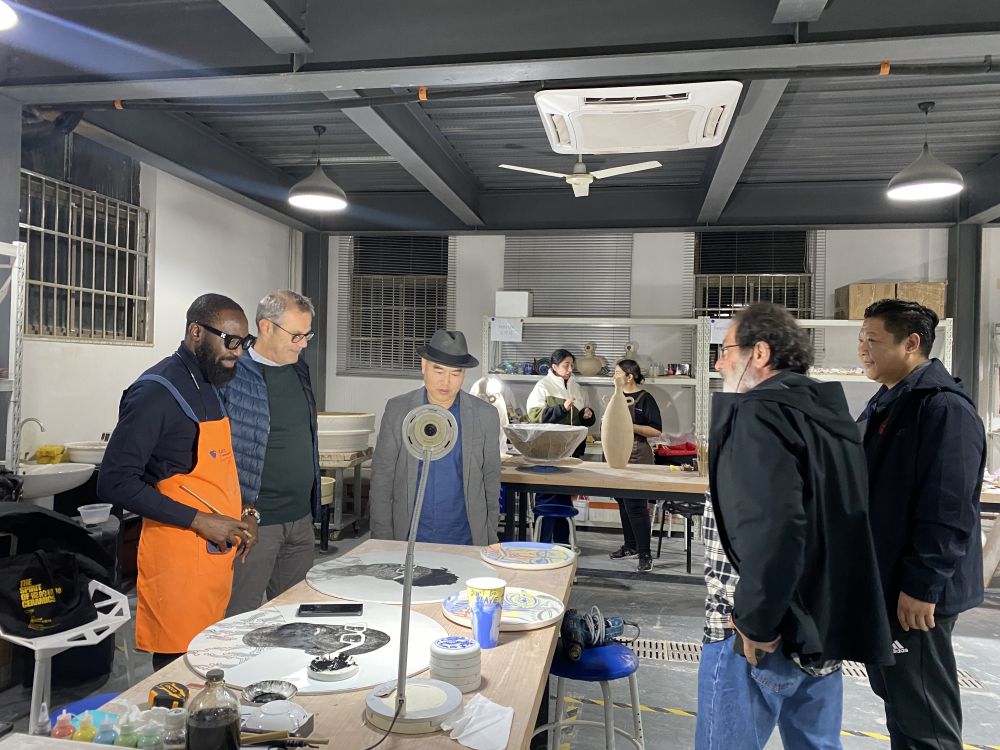 在景德鎮(zhèn)陶瓷大學國際陶藝工作室,剛果(金)陶藝家姆萬加·斯坦尼斯正在與藝術家們交流創(chuàng)作心得。(受訪者供圖)