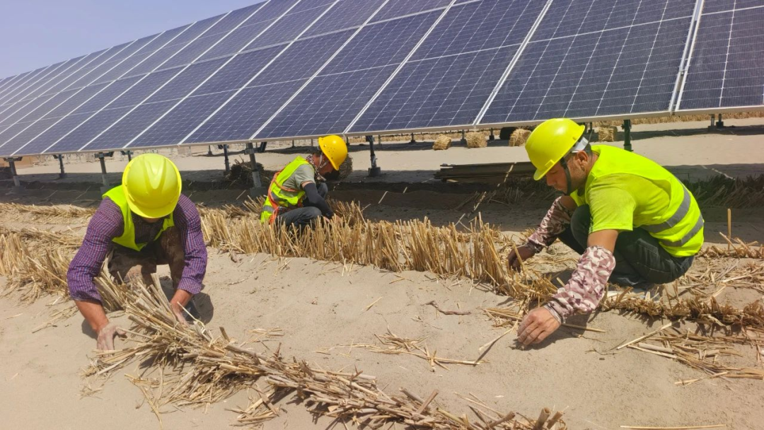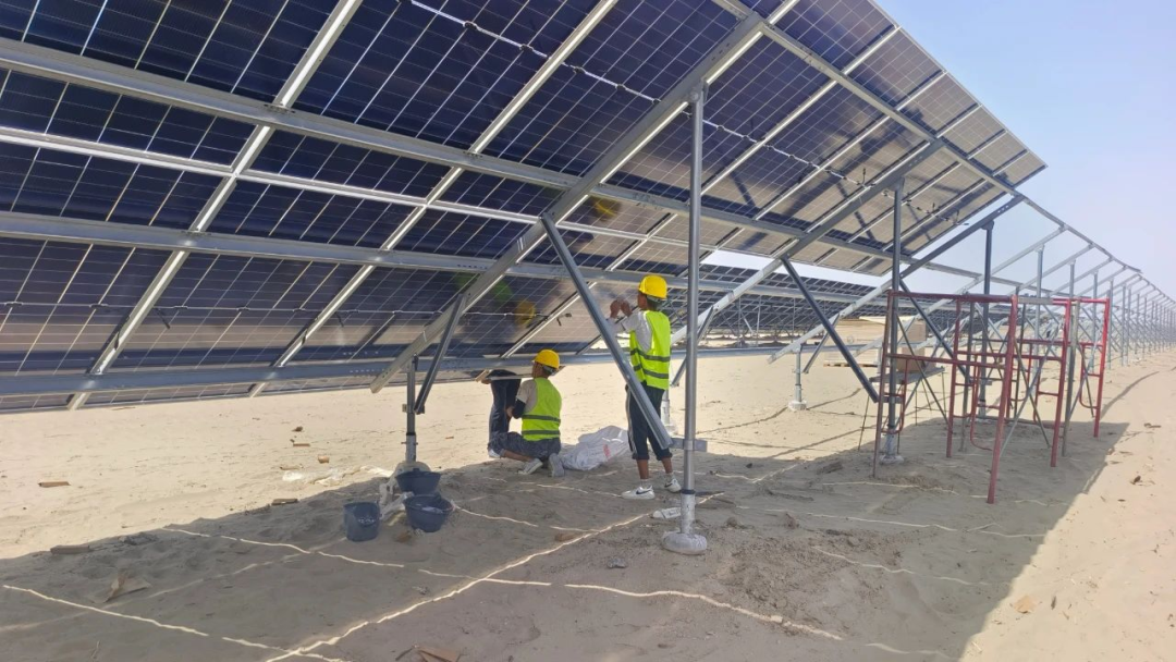 3月28日,在中國電建集團新疆分公司新能源公司沙雅縣25萬千瓦光伏項目施工現(xiàn)場,工人們正緊張地安裝光伏板,周圍草方格的鋪設及梭梭的栽種也在同步開展當中。該項目施工負責人郝澤權說,光伏發(fā)電助力機電井抽取沙漠地表百米以下的微咸水灌溉梭梭林,解決了長期以來沙漠植綠缺水難題,實現(xiàn)生態(tài)與經(jīng)濟的雙重收益。
