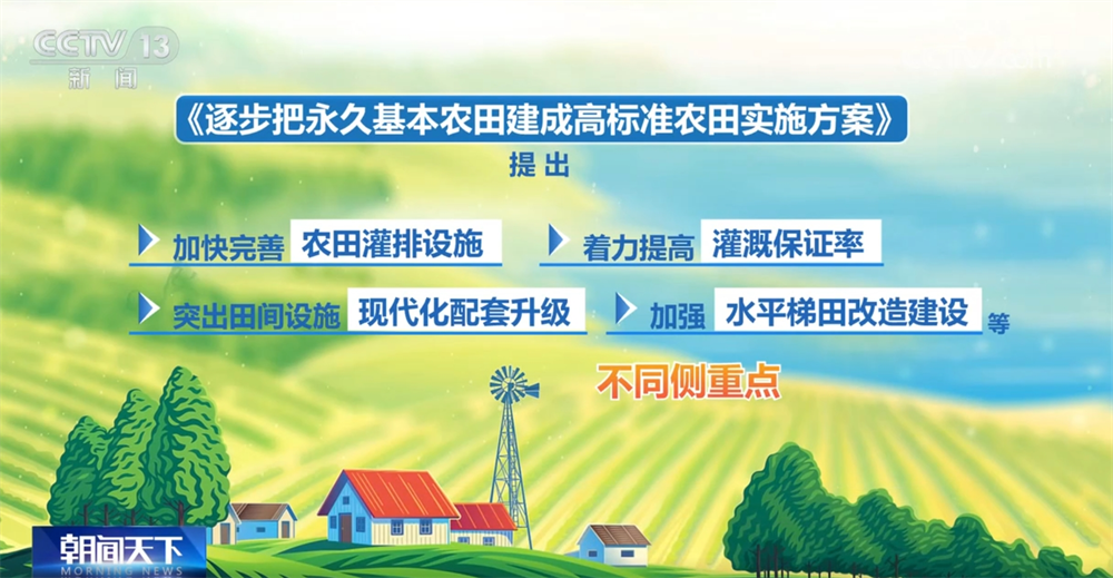《實施方案》提出,以田塊平整、通水通路、提升地力產(chǎn)量效益為基本標準,合理確定不同區(qū)域、不同類型高標準農(nóng)田建設(shè)標準和投入標準。統(tǒng)籌開展田、土、水、路、林、電、技、管綜合治理,將建設(shè)重點放在田內(nèi)。
