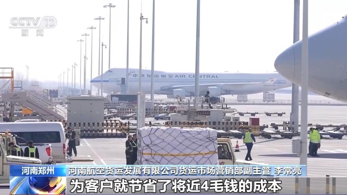 河南航空貨運發(fā)展有限公司貨運市場營銷部 李常亮:時效能夠提升3到6個小時,而且我們現(xiàn)在對中轉(zhuǎn)貨實行一次性收費,算下來相當(dāng)于我們一公斤為客戶就節(jié)省了將近4毛錢的成本。