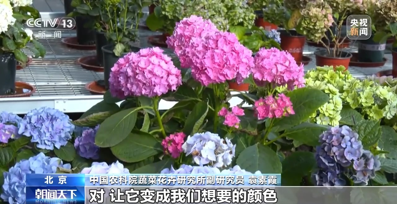 中國農(nóng)科院蔬菜花卉研究所副研究員 袁素霞:讓它往藍變的過程中,變成其他的顏色,比如藍紫色、紫羅蘭色都是可以的。因為我們在土壤中加入了一個關(guān)鍵的重要物質(zhì)鋁離子,可以精準調(diào)控,可以讓花變成我們想要的顏色。
