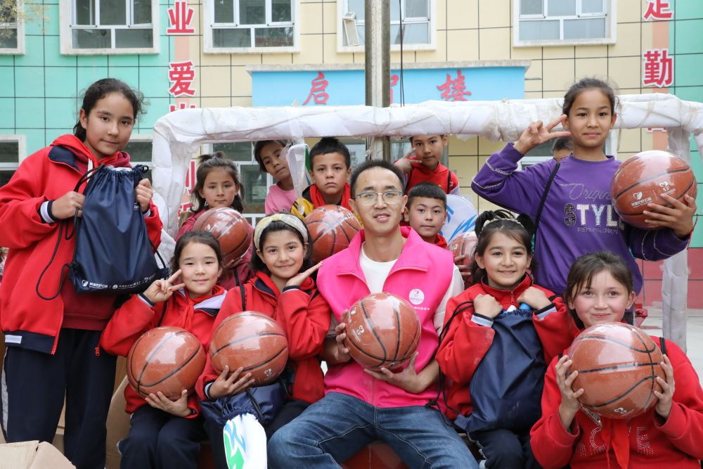 “上個學(xué)期曹永祺給我們學(xué)校聯(lián)系捐贈了一批體育器材?!卑⒖颂湛h皮拉勒鄉(xiāng)阿克提其村小學(xué)4年級2班班主任米娜瓦爾·巴拉提江說,“現(xiàn)在我們學(xué)校的學(xué)生基本上都認(rèn)識他,學(xué)生也特別樂意拉著他一起玩?!?/p>