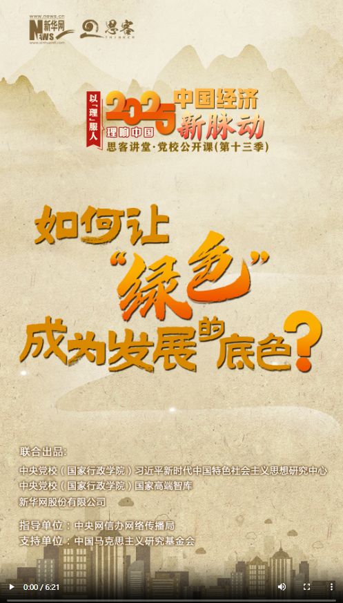 新一季“思客講堂·黨校公開課”《理響中國·以理服人|2025中國經(jīng)濟(jì)新脈動》,帶你讀懂2025年經(jīng)濟(jì)工作重點。藍(lán)天、碧水、凈土;節(jié)能、減排、降碳;生態(tài)優(yōu)先、綠色消費、零碳工廠……一個個生動的綠色畫筆,勾勒出高質(zhì)量發(fā)展的底色。綠色打底,發(fā)展更優(yōu)。怎么讓“綠色”成為發(fā)展的底色?如何激活全面綠色轉(zhuǎn)型的潛力?中央黨校(國家行政學(xué)院)社會和生態(tài)文明教研部副教授韓融給出了答案。