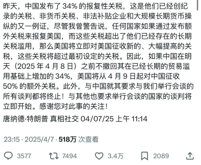 一覺醒來,特朗普再發(fā)威脅,警告中國在4月8號前取消報復,不然4月9號就對中國再加50%額外關(guān)稅,此外所有和中國的談判都會中止,而和其他國家的談判將立即開始。
