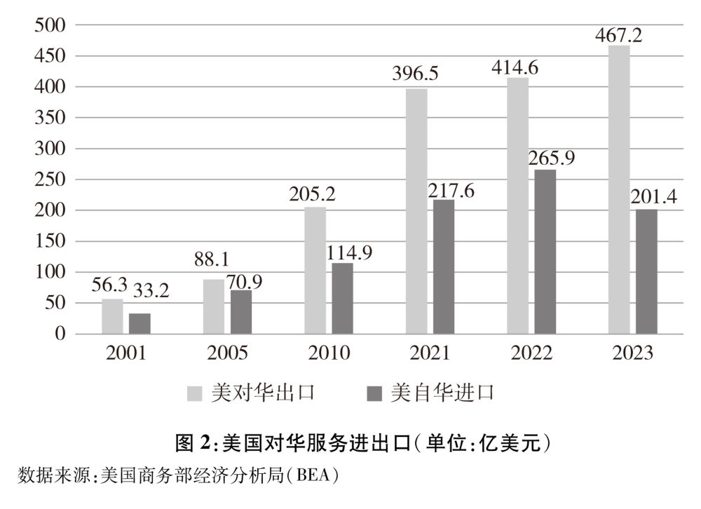 美國服務(wù)業(yè)產(chǎn)業(yè)門類齊全,具有較強國際競爭力??傮w來看,隨著經(jīng)濟(jì)不斷發(fā)展和人民生活水平提升,中國對服務(wù)需求明顯擴大,中美雙方服務(wù)貿(mào)易快速增長。據(jù)美國商務(wù)部統(tǒng)計,2001-2023年,中美服務(wù)貿(mào)易額由89.5億美元擴大到668.6億美元,增長了6倍(圖2)。根據(jù)中方統(tǒng)計,2023年,美國是中國第二大服務(wù)貿(mào)易伙伴;據(jù)美方統(tǒng)計,中國是美國第五大服務(wù)出口目的地。