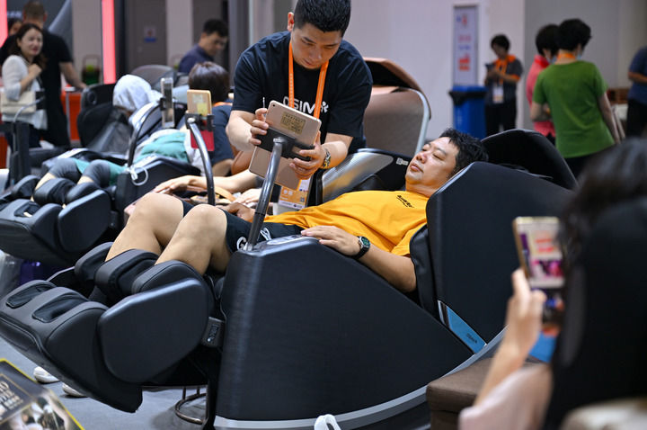 2024年4月17日,參觀(guān)者在第四屆消博會(huì)上體驗(yàn)傲勝按摩椅。新華社記者 郭程 攝