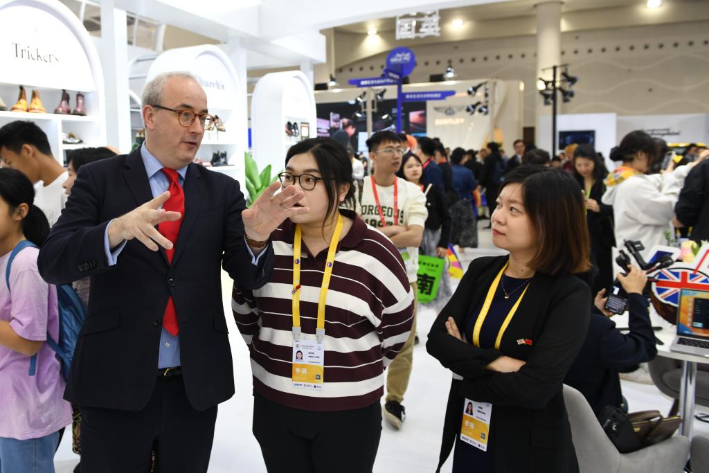 4月13日,外方人員在第五屆消博會英國國家館與中方工作人員交流。新華社記者 孫笑天 攝