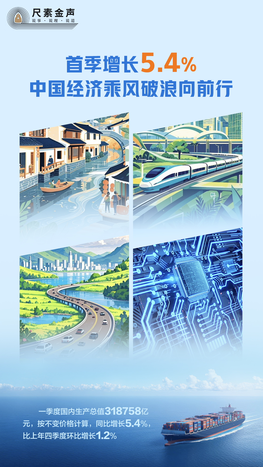初步核算,一季度國內生產總值318758億元,按不變價格計算,同比增長5.4%,比上年四季度環(huán)比增長1.2%。